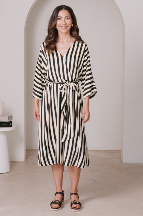 Embrace timeless elegance with the Francesca Dress. Crafted from a soft, flowing rayon blend material, this slip-on dress drapes beautifully, skimming your silhouette in all the right places. The iconic black and ivory vertical stripe print elongates the figure, while the wrap-around belt cinches at the waist to create an hourglass shape. Featuring a chic v-neckline and elegant midi length, this dress is perfect for everything from office days to stylish weekend events.